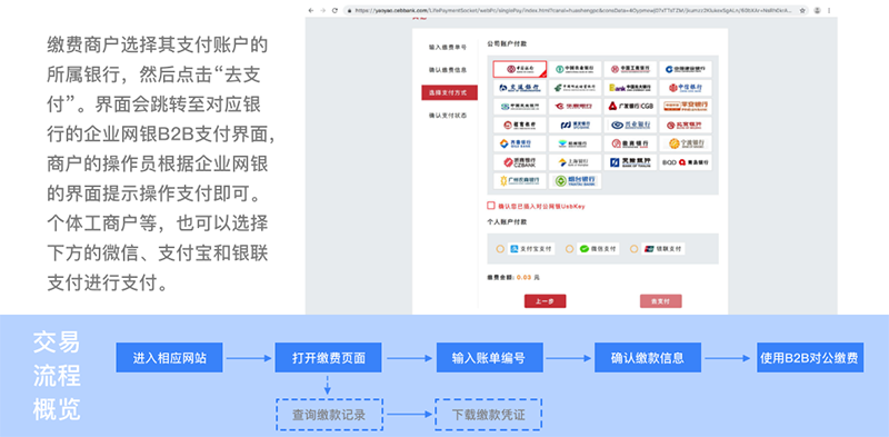 选择支付账户的所属银行,根 据企业网银界面操作支付